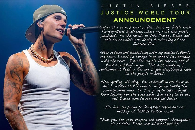 PENYANYI Justin Bieber sekali lagi membatalkan konsert jelajah dunia, JusticeTour ekoran masalah kesihatan yang sedang dialaminya. Berkongsi mengenai pembatalan konsert jelajah berkenaan, Justin memberitahu dia mula berasa penat selepas mengadakan persembahan di Rio de Janeiro minggu lalu. "Ketika mengadakan persembahan di Rock in Brazil saya cuba memberikan persembahan yang terbaik buat penonton. Bieber sebelum ini berkongsi masalah kesihatan yang dialami. "Selepas persembahan tamat, saya mula rasa penat. Saya sedar bahawa masalah kesihatan perlu diutamakan ketika ini. Jadi saya akan berehat daripada mengadakah konsert jelajah buat seketika. "Saya akan kembali sihat namun perlu berehat untuk pulih sepenuhnya," katanya. Penyanyi lagu Baby itu sebelum ini pernah membatalkan beberapa siri konsert jelajah dunia selepas mendedahkan dia mengalami lumpuh separuh wajah akibat penyakit dikenali sindrom Ramsay Hunt. ARTIKEL BERKAITAN: [VIDEO] Justin Bieber lumpuh sebelah muka akibat diserang virus, terpaksa batalkan konsert terdekat "Saya sebelum ini memberitahu tentang masalah sindrom Ramsay Hunt yang menyebabkan sebahagian wajah saya lumpuh dan disebabkan itu saya tidak boleh mengadakan persembahan. "Selepas berehat dan mendapat nasihat doktor dan pihak pengurusan, saya kembali ke Eropah dan mengadakan persembahan di enam lokasi. Ia telah memberi kesan kepada saya," jelasnya. Sementara itu, perkhabaran terbaharu itu membuat peminat terutamanya di Malaysia berasa kecewa dan tertanya-tanya sama ada konsert Justin di Stadium Nasional Bukit Jalil, Kuala Lumpur pada 22 Oktober depan turut dibatalkan. Saya sedar bahawa masalah kesihatan perlu diutamakan ketika ini. Jadi saya akan berehat daripada mengadakah konsert jelajah buat seketika. JUSTIN BIEBER PENYANYI Bagaimanapun peminat boleh menarik nafas lega, apabila penganjur konsert tersebut, PR Worldwide Sdn Bhd memaklumkan konsert Justin di beberapa lokasi di Asia termasuk Kuala Lumpur masih mengikut jadual "Kami berharap Justin akan segera sihat dan menghormati keputusannya untuk berehat dan tidak sabar untuk melihatnya kembali di atas pentas. "Konsert jelajah di Asia akan diteruskan mengikut jadual," kata agensi itu menerusi kenyataan di Instagram. Tiket menyaksikan konsert itu di Kuala Lumpur yang dijual pada Mac lalu habis terjual dalam tempoh beberapa jam sahaja. Selain Malaysia, Justin turut mengumumkan konsert di tiga negara Asia lain iaitu Jakarta, Indonesia dan dua persembahan di Jepun iaitu Osaka dan Tokyo. Dapatkan info dengan mudah dan pantas! Join grup Telegram mStar DI SINI