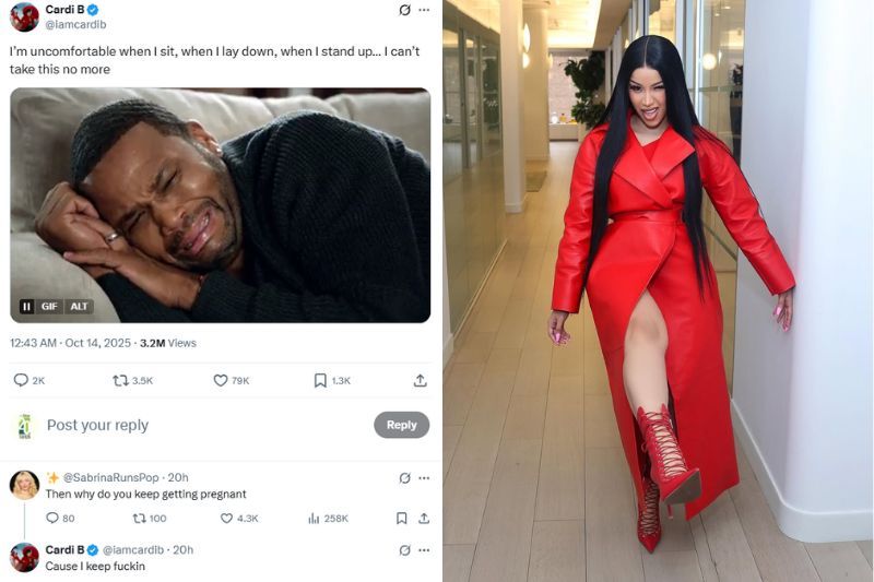 Menerusi satu hantaran di platform X, Cardi memuat naik 'meme' yang memaparkan seseorang sedang menangis bersama kapsyen mendedahkan dia kini berasa tidak selesa untuk duduk, baring atau berdiri akibat kehamilan tersebut.