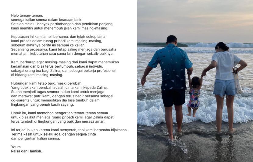 “Apa yang tidak akan berubah adalah cinta kami kepada Zalina. Sudah menjadi tugas seumur hidup kami untuk menjaga dan merawat puteri kami dengan terus hadir bersama sebagai co-parents.