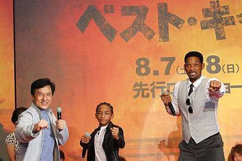 Dari kiri: Jackie Chan, Jaden dan Will Smith menunjukkan aksi selepas sidang akhbar filem "The Karate Kid" di Tokyo. Gambar AFP