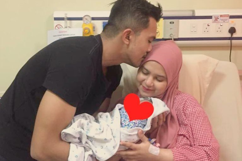 Saharul mengucup dahi isterinya sebagai tanda kasih selepas melahirkan anak pertama mereka. Foto Instagram @saharulridzwan