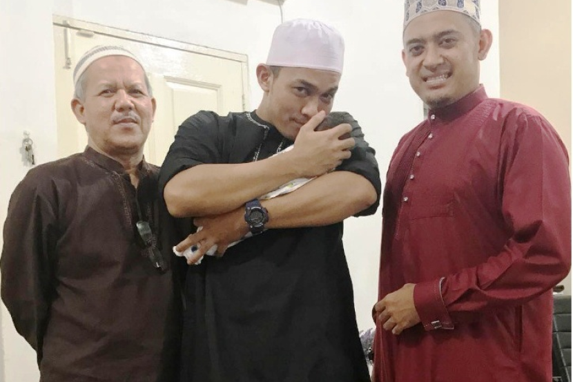Saharul Ridzwan (tengah) memangku anaknya sambil bergambar dengan ustaz Tarmizi Abdul Rahmann (kanan) dan bapanya Hashim Yahya. FOTO: Instagram Saharul Ridzwan.