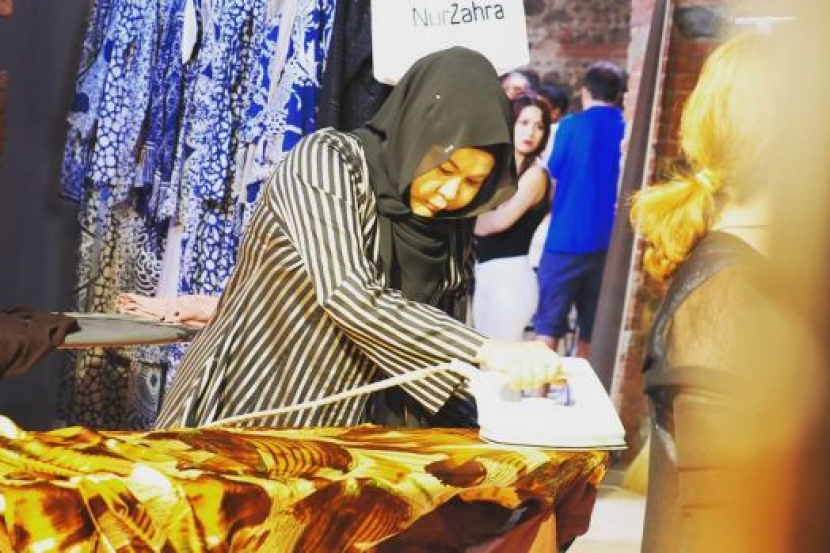 Erma sedang sibuk menggosok pakaian jenamanya pada Torino Fashion Week 2017. Foto Instagram @ermafatima