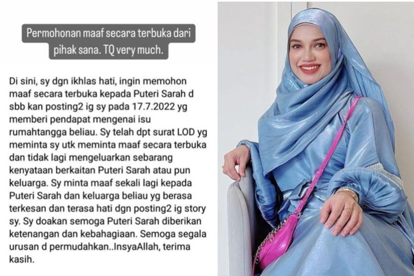 SUSULAN pelakon Puteri Sarah Liyana memfailkan notis saman fitnah terhadap seorang pengguna media sosial, individu tersebut tampil membuat permohonan maaf secara terbuka pada malam Isnin. Individu tersebut dalam kenyataan terbukanya memohon maaf kepada Sarah disebabkan perkongsian di Instagram pada 17 Julai lalu yang memberi komen tentang rumah tangga selebriti itu dengan pengarah Syamsul Yusof. "Di sini saya dengan ikhlas hati ingin memohon maaf secara terbuka kepada Puteri Sarah disebabkan perkongsian Instagram saya pada 17 Julai 2022 yang memberi pendapat mengenai isu rumah tangga beliau. Kenyataan fitnah netizen terhadap Sarah. "Saya telah menerima LOD (Letter of Demand) yang meminta saya untuk meminta maaf secara terbuka dan tidak lagi mengeluarkan sebarang kenyataan berkaitan Puteri Sarah atau pun keluarganya," katanya. Dalam permohonan maaf itu juga, individu tersebut turut mendoakan agar pelakon itu diberikan ketenangan dan kebahagiaan serta dipermudahkan semua urusan. Sarah yang mengulang siar kenyataan berkenaan di Instagram Story mengucapkan terima kasih atas permohonan maaf yang dibuat individu tersebut. ARTIKEL BERKAITAN: “Sila jaga kata-kata serta keluarga sendiri!” - Tidak biar diri terus dibuli, Puteri Sarah hantar notis saman fitnah kepada netizen ARTIKEL BERKAITAN: “Sampai bila mahu dipijak-pijak?” - Puteri Sarah saman Ira Kazar, nampak jalan selepas solat istikharah Terdahulu, tindakan Sarah itu dilihat bermula apabila individu berkenaan membalas satu kenyataan yang pernah dikongsi pelakon ini di media sosial dan menunjukkan dia seperti diserang dengan kenyataan balas memburukkan dirinya. "Ini semua sebab suami dia kaya. Sebab itu dia pertahankan rumah tangga walaupun suami curang. "Isteri dia takkan lepaskan sebab suami kaya. Jadi apa-apa pun 'penyondol' yang salah. Terang-terangan dia tak nak dimadukan dan provoke satu Malaysia untuk benci skandal suami dia," tulis komen berkenaan. Saya telah menerima LOD (Letter of Demand) yang meminta saya untuk meminta maaf secara terbuka dan tidak lagi mengeluarkan sebarang kenyataan berkaitan Puteri Sarah atau pun keluarganya NETIZEN Melihat ia sebagai satu kenyataan fitnah, Sarah mengambil tindakan memfailkan notis saman menerusi peguamnya Natasha Basheer and Associate. Menerusi perkongsian sebelum ini, Sarah menjelaskan apa dilakukan adalah sebagai pengajaran buat mana-mana pihak agar tidak mudah membuat spekulasi tentang dirinya. "Pengajaran kepada orang luar, jangan buat sebarang spekulasi berdasarkan apa yang anda lihat dan dengar tanpa bukti kukuh. “Jangan buat fitnah fasal saya dan sila jaga kata-kata serta keluarga sendiri," katanya Dapatkan info dengan mudah dan pantas! Join grup Telegram mStar DI SINI