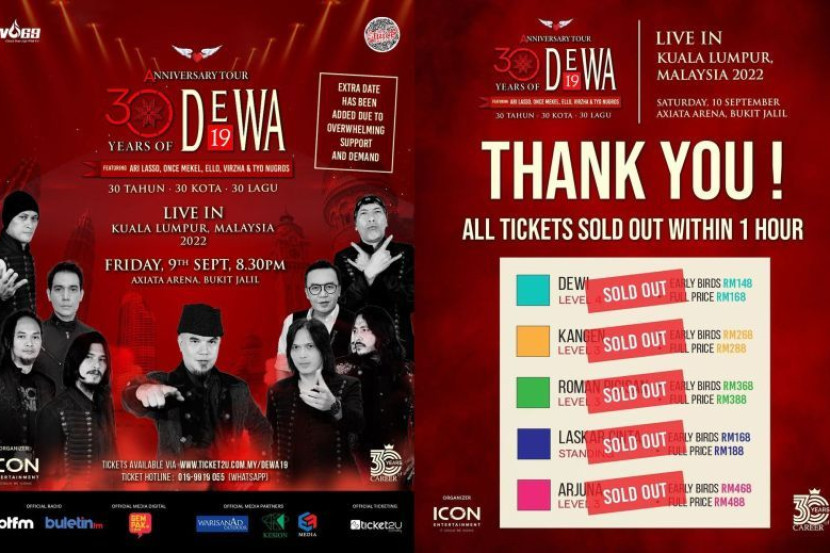 TIDAK sampai sejam, tiket Konsert 30 Years of Dewa 19 yang mula dijual pada Isnin lalu habis terjual sehinggakan ramai peminat kumpulan terkenal Indonesia itu melahirkan rasa kecewa. Namun peminat melahirkan rasa lega apabila vokalis dan gitaris kumpulan itu, Ahmad Dhani mengumumkan konsert di Kuala Lumpur ditambah satu lagi tarikh iaitu sehari lebih awal iaitu pada Jumaat, 9 September 2022 di Axiata Arena, Bukit Jalil, Kuala Lumpur. Ahmad Dhani dalam kenyataan di Instagram Dewa 19 melahirkan rasa terharu dan bangga dengan sambutan luar biasa terhadap konsert kumpulan itu di Malaysia. "Dalam tempoh sejam tiket habis terjual, kami sangat berbesar hati dengan sokongan Baladewa dan Baladewi di Malaysia khususnya Kuala Lumpur. "Oleh itu, Dewa 19 menambah satu lagi malam konsert pada hari Jumaat, 9 September 2022. Jangan berlengah lagi, dapatkan tiket konsert bermula pukul 3 petang, Selasa, 19 Julai 2022," katanya. Ahmad Dhani juga memberitahu Malaysia adalah satu-satunya lokasi kumpulan itu muncul dengan dua konsert. ARTIKEL BERKAITAN: Tiket sold out dalam tempoh sejam, peminat teruja tunggu gabungan 4 vokalis Dewa 19 di KL Istimewa konsert ini, kesemua empat vokalis yang pernah menganggotai Dewa 19 turut hadir membuat persembahan iaitu Ari Lasso, Once Mekel, Virzha dan Ello selain Ahmad Dhani yang menjadi tulang belakang kumpulan ini. Dalam konsert jelajah kali ini, Dewa 19 mengadakan persembahan di 30 buah lokasi termasuk Kuala Lumpur dan akan menyanyikan 30 lagu-lagu popular mereka sebagai simbolik tiga dekad dalam industri. Peminat boleh mendapatkan tiket di www.ticket2u.com.my. dan tiket dijual pada harga RM148 sehingga RM488. Dapatkan info dengan mudah dan pantas! Join grup Telegram mStar DI SINI
