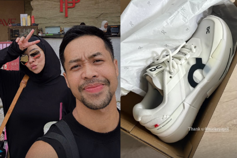 Menerusi perkongsian itu, Mickey dilihat menghadiahkan sepasang kasut putih jenama QC kepada Nora.
