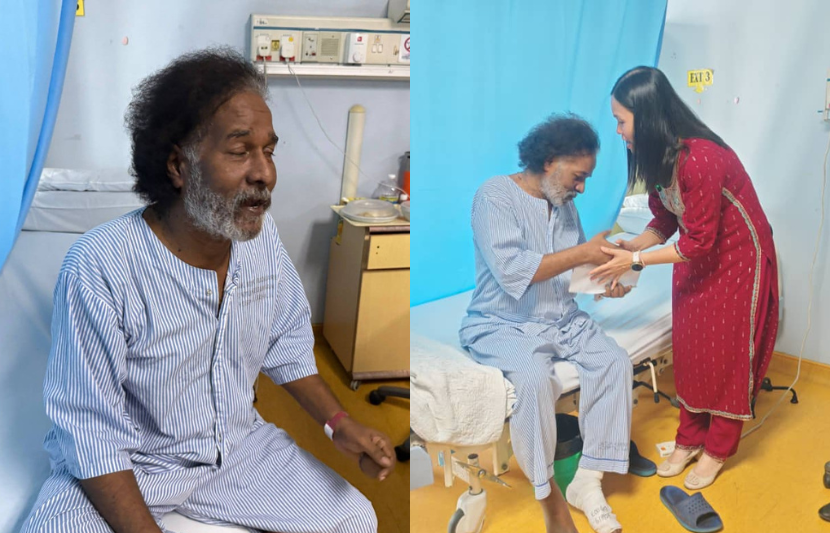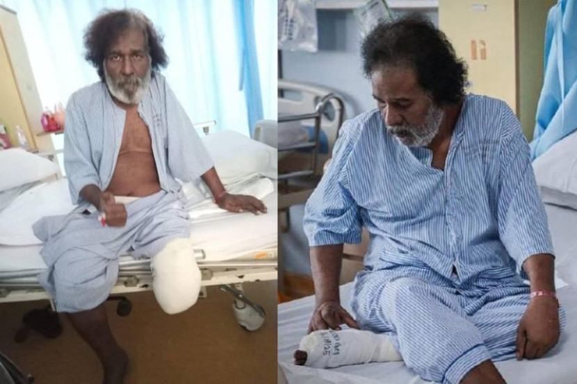Terdahulu, satu hantaran di Facebook sebuah portal berita memaparkan foto Sathia duduk di katil hospital dengan kaki kirinya sudah dipotong ke paras lutut.