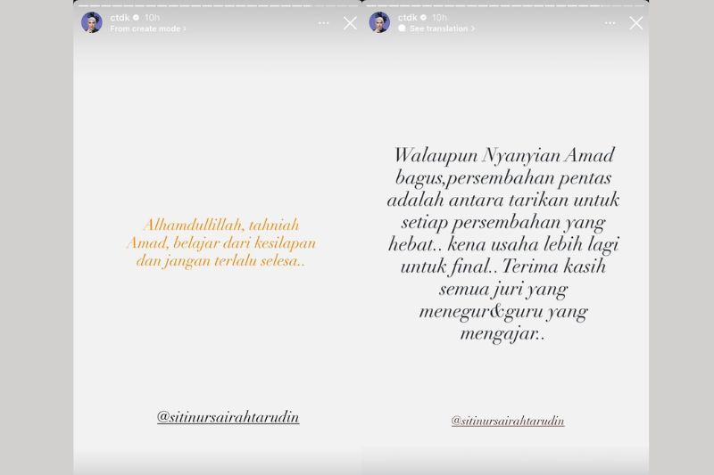 "Kena usaha lebih lagi untuk final (minggu akhir). Terima kasih semua juri yang menegur dan guru yang mengajar," katanya.