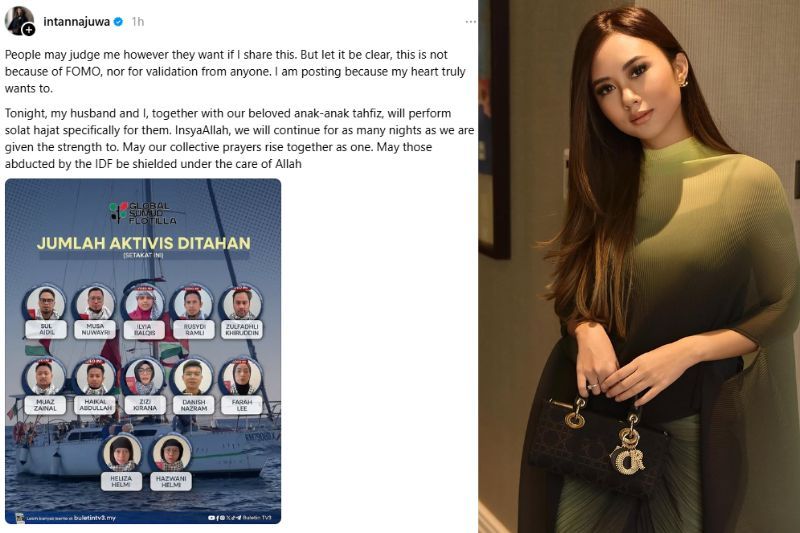 PELAKON Datin Intan Najuwa dan suami, Datuk Ahmad Azraf Azman akan melakukan solat hajat pada malam Khamis sebagai tanda sokongan untuk para pejuang yang menyertai misi kemanusiaan Global Sumud Flotilla (GSF) ke Gaza.