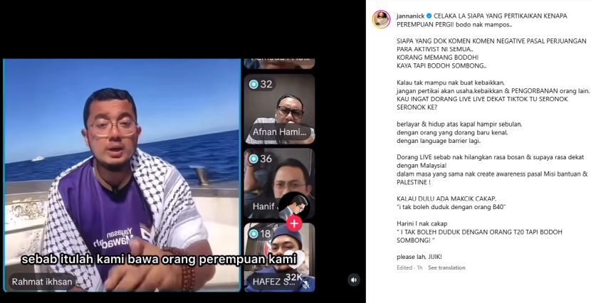 TIDAK dapat menahan rasa geram, pelakon popular Janna Nick tampil menyelar individu yang mempersoalkan penglibatan aktivis wanita dalam misi kemanusiaan Global Sumud Flotilla (GSF) ke Gaza, Palestin.