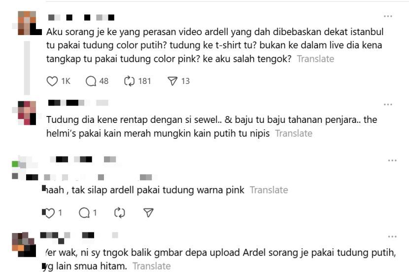 "Ardell punya hijab dah bertukar putih. Kena paksa buang tudung. Gaya mereka anggap aktivis itu pengganas," antara hantaran netizen di Threads.
