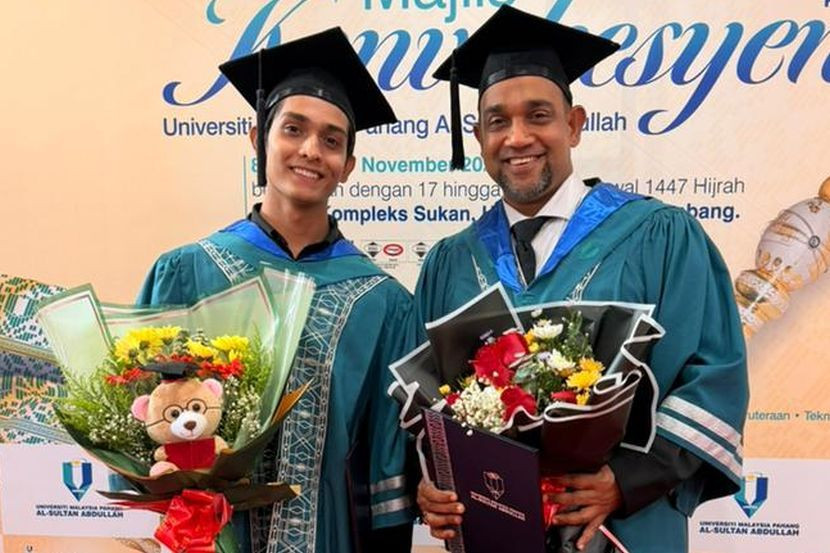 Izzrin dan bapanya menerima pengiktirafan mereka di Majlis Konvokesyen UMPSA ke-20 dalam sesi yang berlangsung pada 10 November lalu.