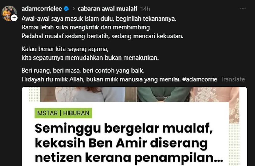 "Kalau benar sayang agama, kita sepatutnya memudahkan bukan menakutkan. Beri ruang, beri masa, beri contoh yang baik. Hidayah itu milik Allah, bukan milik manusia yang menilai," katanya.