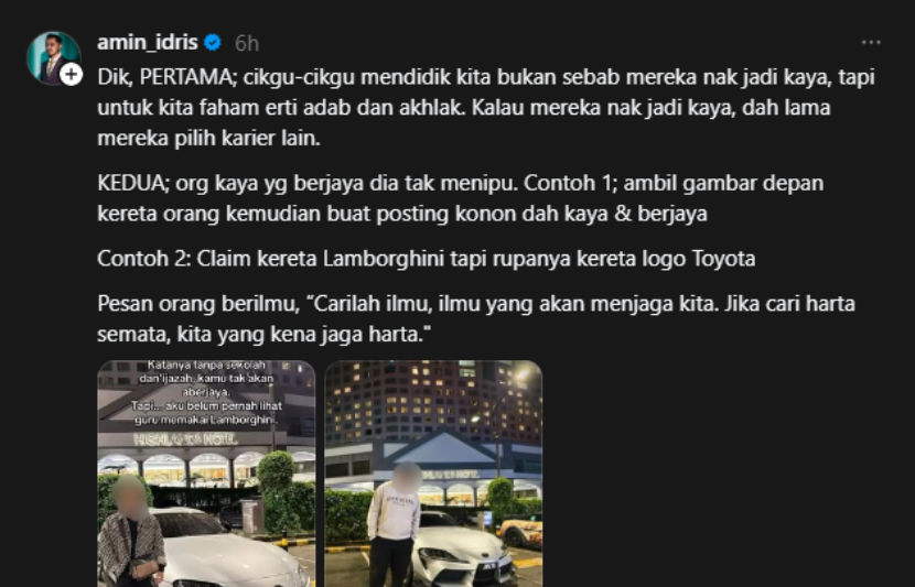 PENDAKWAH selebriti, Amin Idris menegur sikap segelintir individu yang mempersoalkan kerjaya guru apabila dilihat tidak hidup mewah atau memandu kereta berjenama.