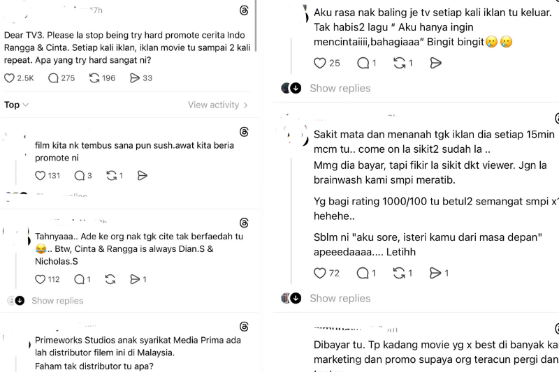“Kepada TV3. Mohon berhenti try hard promosi cerita Indonesia, Rangga & Cinta. Setiap kali iklan, promosi filem ini sampai dua kali ulang. Apa yang try hard sangat ni?