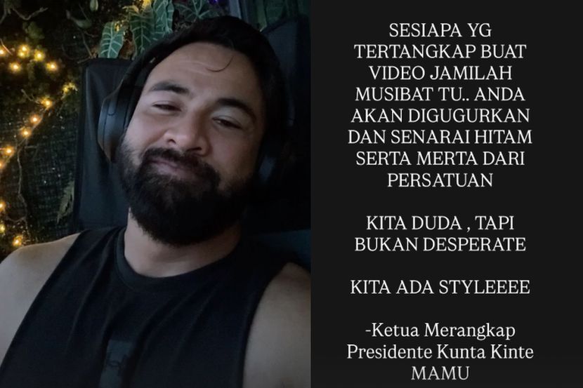 "Kepada semua ahli dan prospek Persatuan Duda-duda Malaysia (PDDM). Sesiapa yang tertangkap buat video Jamilah itu anda akan digugurkan dan disenarai hitam serta merta dari persatuan," katanya.