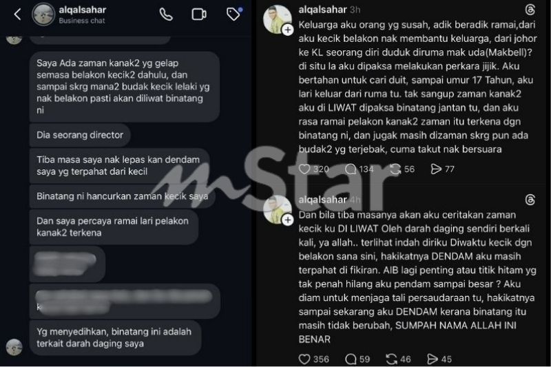 AKTOR Alqal Sahar tampil membuat pendedahan mengejutkan apabila mendakwa pernah diliwat seorang pengarah ketika di zaman kanak-kanak.Alqal mendakwa kejadian itu berlaku ketika dia terbabit dunia lakonan bagi membantu menyara keluarganya yang hidup dalam kesusahan. "Saya ada zaman kanak-kanak yang gelap semasa berlakon dahulu dan sampai sekarang mana-mana budak lelaki kecil yang nak berlakon pasti akan diliwat binatang (si pelaku) ini. Pendedahan Alqal yang dikongsi bersama mStar."Dia seorang pengarah. Tiba masa saya nak lepaskan dendam yang terpahat sejak kecil. "Dia sudah hancurkan zaman kanak-kanak saya dan saya percaya ramai lagi pelakon kanak-kanak yang terkena. Apa yang menyedihkan, binatang (si pelaku) ini adalah terkait darah daging saya," luahnya kepada mStar dalam satu mesej peribadi yang dihantar di Threads. Alqal turut mendedahkan kisah hitam yang dilalui dalam beberapa hantaran di Threads miliknya. ARTIKEL BERKAITAN: P. Diddy dituduh liwat kanak-kanak berusia 10 tahun, peserta program realiti turut jadi mangsaARTIKEL BERKAITAN: Pelakon lelaki dakwa diliwat dua individu, tak sedar kerana diberi dadahDalam perkongsian itu, Alqal mendakwa dia menanggung penderitaan tersebut selama bertahun-tahun sebelum mengambil keputusan meninggalkan rumah berkenaan ketika berusia 17 tahun."Keluarga aku orang susah, adik beradik ramai dari kecil aku berlakon nak membantu keluarga. Dari Johor ke Kuala Lumpur seorang diri duduk rumah Mak Uda (ibu saudara). "Di situlah aku dipaksa melakukan perkara jijik. Aku bertahan untuk cari duit sampai umur 17 tahun. Aku keluar daripada rumah itu. Tak sanggup zaman kanak-kanak aku diliwat dipaksa binatang jantan (si pelaku) dan aku rasa di zaman sekarang pun ada budak-budak yang terjebak cuma takut nak bersuara," ujarnya. Alqal sebelum ini memulakan kerjaya sebagai pelakon kanak-kanak.Menurut Alqal yang pernah membintangi drama Diari Ramadhan Rafique, selama ini dia memilih untuk berdiam diri demi menjaga hubungan kekeluargaan, namun trauma dan dendam itu masih menghantui dirinya sehingga kini."Bila tiba masanya akan aku ceritakan zaman kecilku diliwat oleh darah daging sendiri berkali-kali. Ya Allah. Terlihat indah diriku di waktu kecil dengan berlakon sana sini, hakikatnya dendam aku masih terpahat di fikiran. "Aib lagi penting atau titik hitam yang tak pernah hilang aku pendam sampai besar? Aku diam untuk menjaga tali persaudaraan itu, hakikatnya sampai sekarang aku dendam kerana binatang itu masih tidak berubah, sumpah nama Allah ini benar," katanya.Jadilah sebahagian daripada geng mStar! Follow kami di Telegram, Twitter, TikTok, Facebook, Instagram dan YouTube