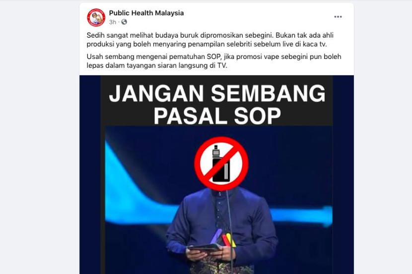 GARA-GARA menggantung rokok elektronik atau vape di leher ketika menyampaikan anugerah bagi kategori Artis Baharu Popular di Anugerah Bintang Popular ke-33 (ABPBH33), pelakon Shahiezy Sam menerima kecaman netizen. Malah, tindakan suami pelakon Syatilla Melvin itu turut ditegur pengendali akaun Facebook Public Health Malaysia (PHM) yang mempersoalkan tanggungjawab pihak produksi tidak menyaring penampilan selebriti tersebut sebelum bersiaran secara langsung. ARTIKEL BERKAITAN: TV3 kesal! Semua selebriti sudah diberi penerangan sebelum ABPBH33 berlangsung tapi Shaheizy Sam tak peka PHM turut menyifatkan tindakan pelakon itu telah mempromosikan penggunaan vape dalam kalangan masyarakat. Pengendali akaun Public Health Malaysia membuat teguran di perkongsian Facebook pada Jumaat. "Sedih sangat melihat budaya buruk dipromosikan sebegini. Bukan tak ada ahli produksi yang boleh menyaring penampilan selebriti sebelum live di kaca tv. "Usah sembang mengenai pematuhan SOP, jika promosi vape sebegini pun boleh lepas dalam tayangan siaran langsung di TV, ” tulisnya. Sementara itu, Shaheizy menjelaskan bahawa dia terlupa untuk menanggalkan vape berikutan keadaan kelam kabut sebelum naik ke pentas. “Terlupa sebab kelam-kabut. Memang sejak dahulu lagi, saya ke hulu ke hilir bawa banyak vape sebab bateri cepat habis, ”kata Sam menerusi laporan Kosmo! Online. Dalam perkembangan lain, ABPBH33 menyaksikan kemenangan penyanyi Haqiem Rusli sebagai Bintang Paling Popular yang berlangsung di Axiata Arena, Bukit Jalil pada malam Jumaat. Nak macam-macam info? Join grup Telegram mStar! TONTON VIDEO PILIHAN!