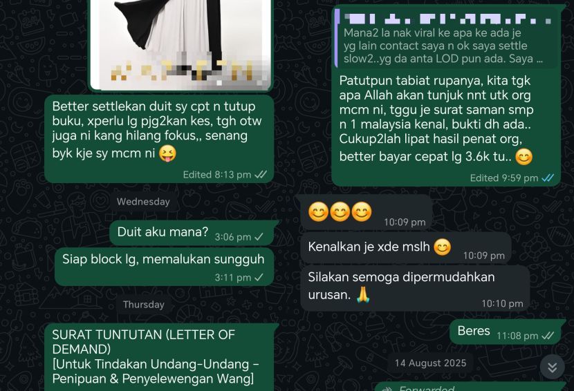 "Selepas itu dia ada buat pembayaran sebanyak RM400 sebab dia kata wajib bayar hutang. Tapi ini bukan hutang tetapi dia selewangkan duit saya, dia tipu saya," katanya lagi.