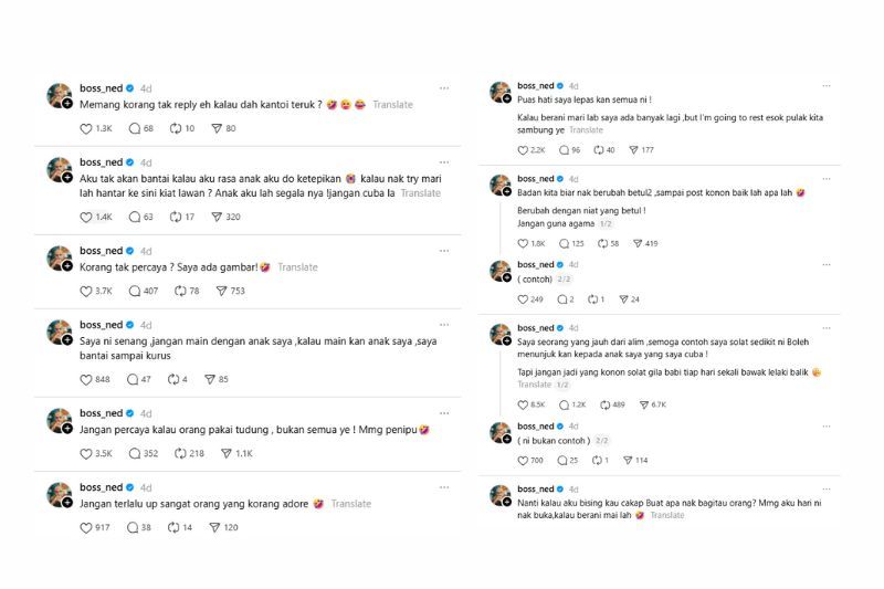 Sebelum ini, Nedim atau lebih dikenali sebagai Boss Ned menarik perhatian ramai selepas memuat naik beberapa hantaran di Threads meluahkan rasa kecewa terhadap individu yang didakwa cuba mengganggu anaknya.