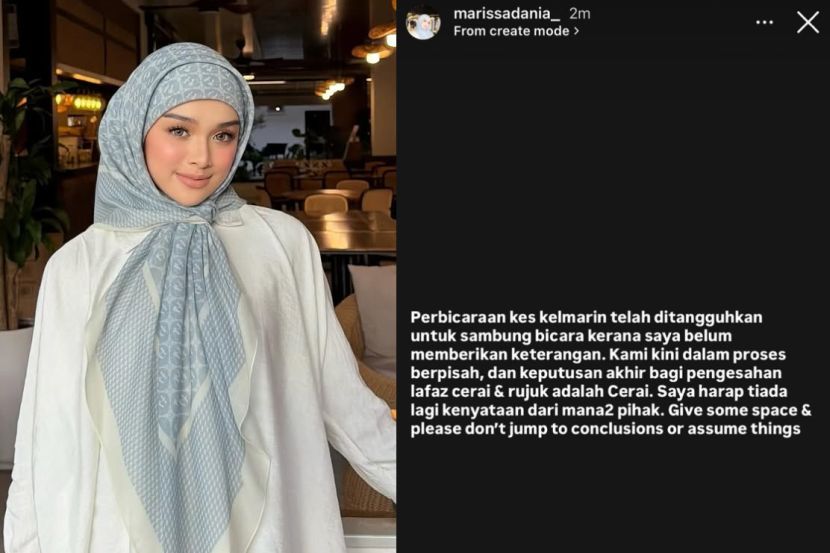 ANAK kepada Abby Abadi iaitu Marissa Dania memberi bayangan hubungan dengan suami, Ahmad Aslam, bakal berakhir. Marissa, 21, berkata perbicaraan kes lafaz cerai luar mahkamah yang sedang berlangsung pada Isnin lalu terpaksa ditangguhkan kerana pihaknya masih belum memberi keterangan di mahkamah. "Perbicaraan kes kelmarin telah ditangguhkan untuk sambung bicara kerana saya belum memberi keterangan. Marissa beri bayangan rumah tangga."Kami kini dalam proses berpisah dan keputusan akhir bagi pengesahan lafaz cerai dan rujuk adalah cerai," katanya dalam hantaran InstaStory.Dalam pada itu, dia berharap orang ramai tidak mengeluarkan sebarang sepkulasi melibatkan perkahwinannya lagi."Saya harap tiada lagi kenyataan dari mana-mana pihak, bagi ruang dan jangan buat sebarang kesimpulan atau andaian," ujarnya.ARTIKEL BERKAITAN: Isteri pertama Aslam ‘berbuih mulut’ nasihat keluarga Marissa ambil tindakan sebelum lebih parah ARTIKEL BERKAITAN: Aslam, Marissa tak lengah daftar nikah lepas kahwin di Thailand, peguam perjelas tiga kekeliruan utamaSebelum ini, Aslam dilaporkan pernah melafazkan cerai terhadap isterinya itu di luar mahkamah pada September 2024 dan Jun 2025. Bagaimanapun pasangan ini dikatakan kembali rujuk sebagai pasangan suami isteri dalam bulan sama ketika kedua-dua lafaz tersebut dibuat. Pasangan ini dilihat di mahkamah bagi perbicaraan pertama pada Isnin lalu.Permohonan untuk pengesahan cerai dan rujuk itu dibuat oleh Aslam atau Ahmad Aslam Saifun Kasyfun Nazir Rasyid, 27, pada 10 Mac lalu. Untuk rekod Marissa bernikah dengan Aslam di Songkhla, Thailand pada 27 Disember 2023 sebagai isteri kedua.Jadilah sebahagian daripada geng mStar! Follow kami di Telegram, Twitter, TikTok, Facebook, Instagram dan YouTube