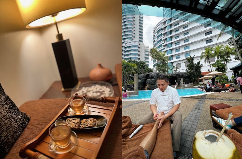 Menariknya spa di sini, tetamu boleh memilih sama ada mahu melakukannya di bilik khas atau di luar sambil menikmati pemandangan di kolam renang dan melihat kanak-kanak riang bermain air.