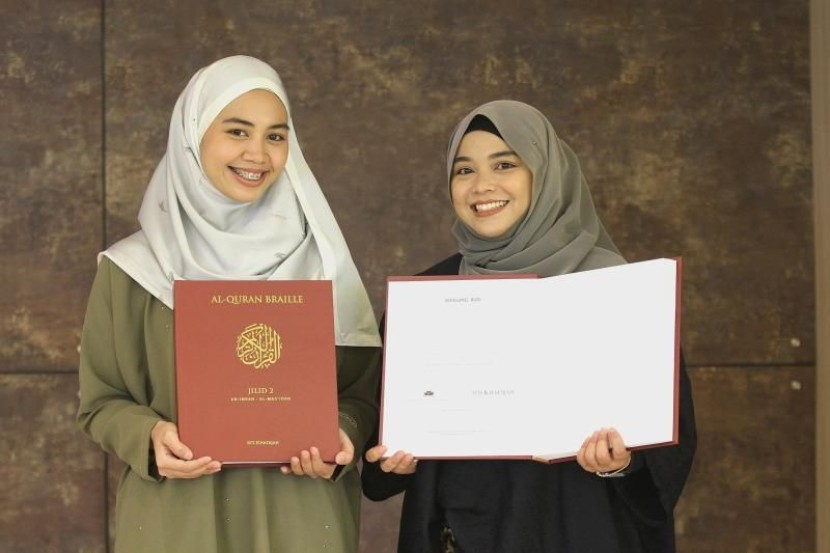 Syakirah (kiri) dan Fatin Nabilah menunjukkan al- Quran Braille yang diterima oleh golongan OKU penglihatan.