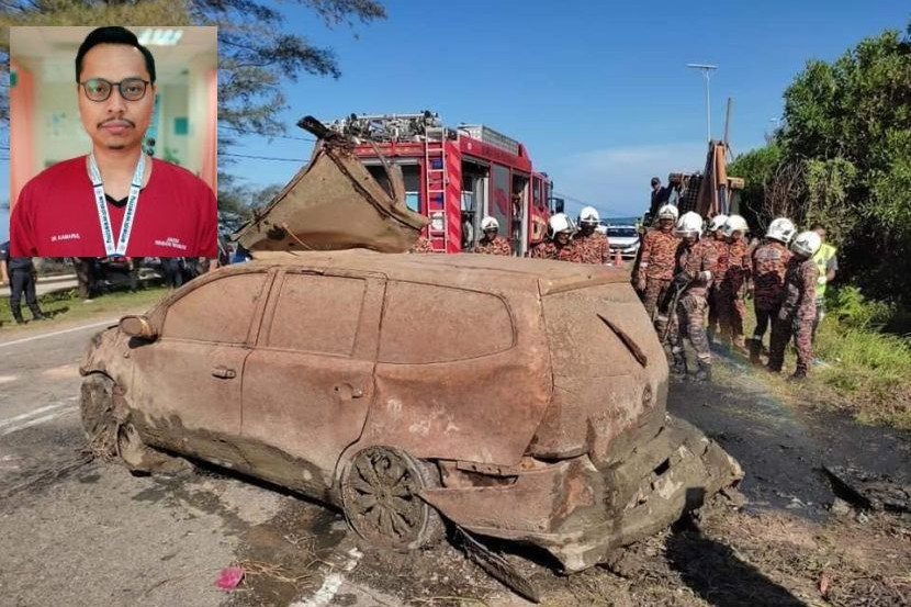 Kenderaan jenis Nissan Grand Livina yang dibawa naik dari sungai di Pekan, pada Sabtu. Gambar kecil Dr Kamarul Ariffin.