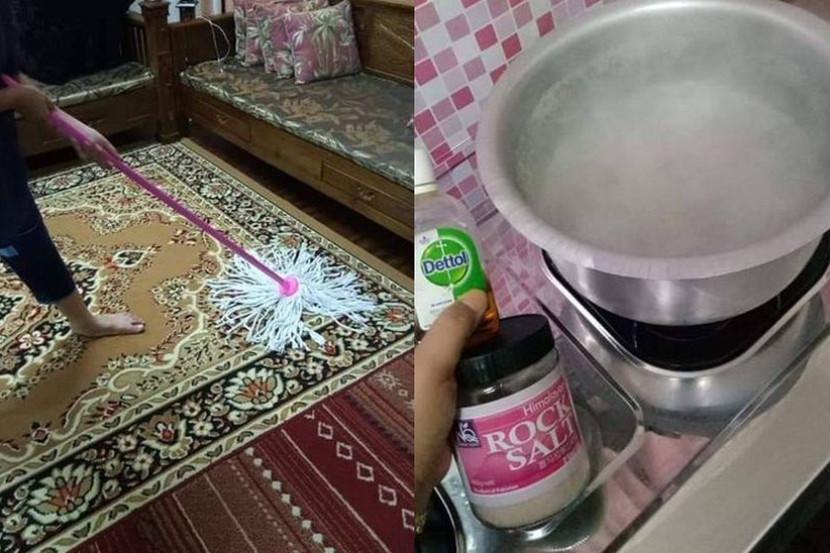 Karpet boleh dicuci menggunakan mop bersama campuran air panas, garam dan cecair pencuci. Foto: Facebook,