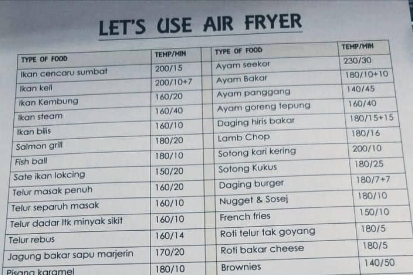 PENGGORENG udara atau lebih dikenali sebagai 'air fryer' menjadi satu kemestian dalam dunia masakan moden hari ini. Selain mudah digunakan, memasak cara ini juga lebih sihat berbanding jika makanan digoreng menggunakan minyak di dalam kuali. Hampir kesemua jenis makanan kering boleh dimasak menggunakan 'air fryer' dan anda hanya perlu melaraskan suhu di panel kawalan ke tahap yang bersesuaian. Namun begitu, suhu di dalam 'air fryer' walaupun terkurang atau terlebih sedikit kepanasannya, boleh menjejaskan kualiti makanan yang dimasak seperti menjadi hangit atau masih mentah. Kini, anda tidak perlu risau kerana melalui satu perkongsian di Facebook, seorang wanita menunjukkan panduan lengkap untuk suhu 'air fryer' yang sepatutnya dan durasi masakan bagi setiap jenis makanan. Panduan itu boleh dirujuk di dalam gambar di bawah ini. Panduan ketetapan suhu penggoreng udara untuk setiap masakan dan durasinya. Disertakan juga beberapa tip tambahan untuk memastikan masakan penggoreng udara anda lebih lazat. 1. Panaskan dulu 'air fyer' anda sebelum mula memasak Makanan akan dapat dimasak dengan sekata sekirang penggoreng udara dipanaskan selama 3 minit sebelum mula memasak. 2. Letakkan sedikit minyak masak ke dalam 'air fryer' Jika mahu makanan anda lebih sedap, boleh letakkan sedikit minyak masak ke dalam penggoreng udara. Kebiasaannya untuk makanan seperti kentang, nuget dan keropok lekor. 3. Letak kertas minyak atau kerajang aluminium di dasar 'air fryer' Tip ini untuk mengelakkan makanan dari melekat pada bakul penggoreng udara yang boleh menyebabkan masakan menjadi bersepah. 4. Jangan penuhkan bakul 'air fryer' anda sehingga tahap maksimum Jika makanan diletakkan terlalu banyak di dalam 'air fryer', ia tidak akan menjadi rangup kerana tidak dapat dimasak secara menyeluruh. Masak sedikit demi sedikit. Selang beberapa minit selepas anda mula memasak di dalam 'air fryer', boleh tarik keluar bakul dan goncangkannya. Ini untuk membantu makanan anda dimasak secara sekata. Jadilah sebahagian daripada geng mStar! Follow kami di Telegram, Twitter, TikTok, Facebook, Instagram dan YouTube