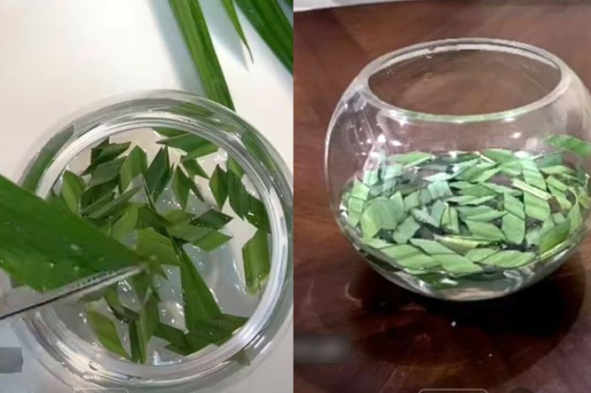 2. Apabila kering, gunting daun pandan tadi supaya bersaiz kecil dan masukkan ke dalam bekas yang bersesuaian.