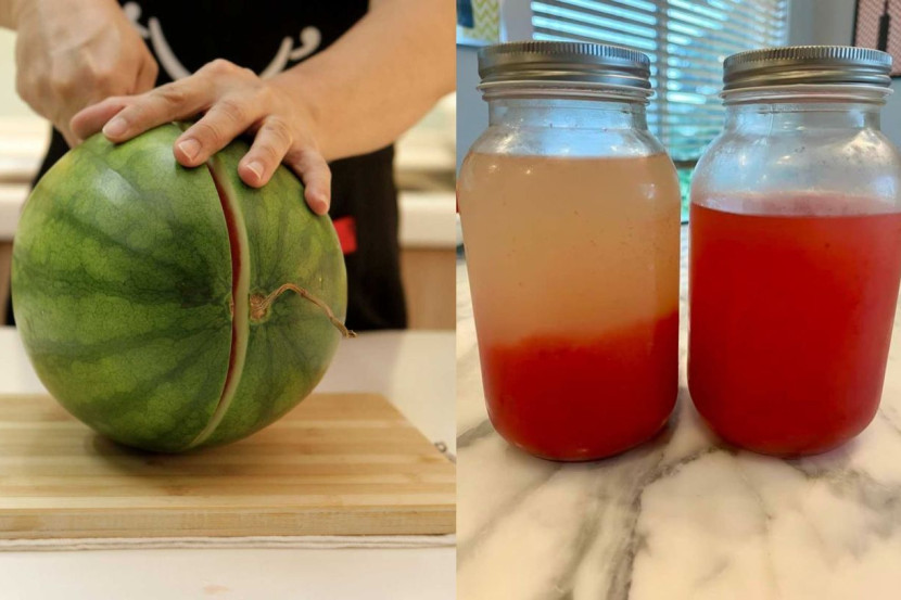 "Keduanya disimpan dalam peti sejuk untuk tiga hari. Apa berlaku? Selepas tiga hari jus tembikai sebelah kiri (tembikai seedless) membentuk dua lapisan. Kalau nak minum kena goncang. Baru sebati semula.