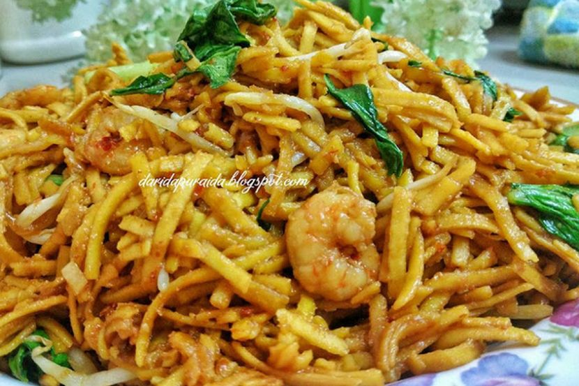 Selain rendang dan nasi impit kuah kacang yang wajib ada ketika rumah terbuka, Mee Sanggul Goreng yang mudah ini juga boleh dihidangkan kepada tetamu. Senang dan cepat! Agak-agak kalau dah terlewat nak masak, boleh cuba resipi simple ini daripada blog Dari Dapur Aida yang ringkas ini! Bahan-bahan: 3 paket mee sanggul 2 ulas bawang merah (dihiris) 2 ulas bawang putih (dihiris) 100 gram udang 5 sudu besar cili kering (dikisar) 3 sudu besar sos tiram Kicap manis secukup rasa Sayur sawi Sayur tauge Cara memasak: Rendam mee sanggul dalam air biasa hingga lembut kemudian toskan. Kemudian panaskan minyak, masukkan bawang merah dan bawang putih, tumis hingga wangi. Seterusnya masukkan cili kisar, tumis hingga pecah minyak. Masukkan udang dan kacau seketika hingga udang berubah warna. Kemudian masukkan sos tiram dan kicap manis. Perasakan dengan garam dan gula. Masukkan mee dan gaul rata. Masukkan taugeh dan sayur sawi gaul hingga semuanya sebati.